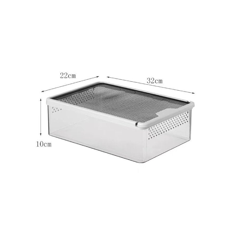 Transparent Reptile Enclosure – Small made from high‑definition PC plastic with a rigid metal mesh lid. The anti‑escape pull switch and double‑lock design keep feeders and tiny pets safely inside while providing excellent airflow and visibility.